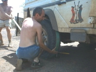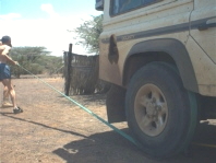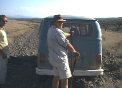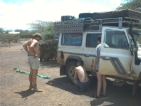 Kurz vor Loyangalani durchfuhren wir wieder ein trockenes Flußbett und wieder flog Peter die Antriebswelle weg. Diesmal