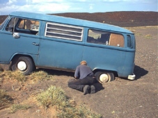 Plötzlich machte der Bus einen Satz zur Seite und saß auf Steinen fest. Da Peter seinen Wagenheber tief im Inneren seines