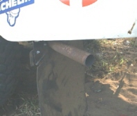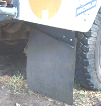 Spritzlappen hinten. Ich mußte unbedingt die Originalen mit dem Land-Rover Emblem haben. Dummerweise kaufte ich sie bei MVS in England wo sie auch schon 20 Jahre in einer Tüte verbracht haben. Das Gummi war so porös das die Pistensteine den Spritzlappen “gesteinigt” haben. Ein paar Stücke Förderbandgummi halten jetzt besser...