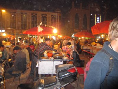 Viel Lammspieße gewürzt mit Kreuzkümmel - einfach nur lecker. Das Wetter ist wie ein deutscher Frühling kühl, sonnig mit einem mäßigem Wind. Die Menschen sind sehr freundlich und wollen ständig auf chinesisch mit